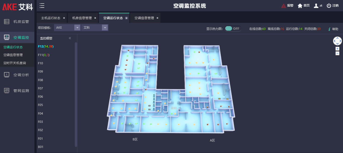 艾科智慧建筑能源管理平臺(tái),掌握設(shè)備實(shí)時(shí)連接狀態(tài)與通訊情況,監(jiān)測(cè)系統(tǒng)末端設(shè)備運(yùn)行情況,可視化設(shè)備分布情況,實(shí)現(xiàn)末端設(shè)備遠(yuǎn)程統(tǒng)一管理。